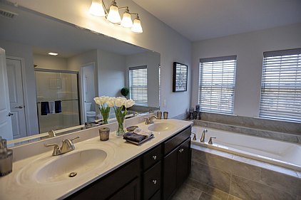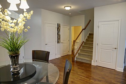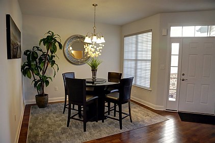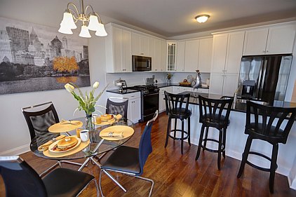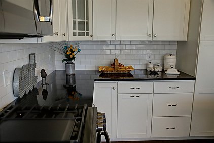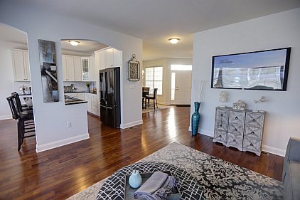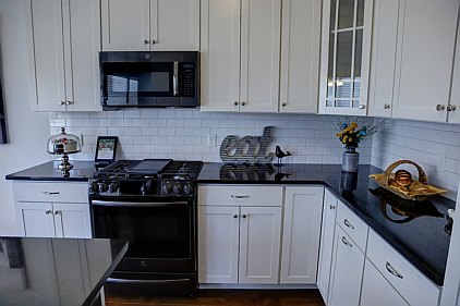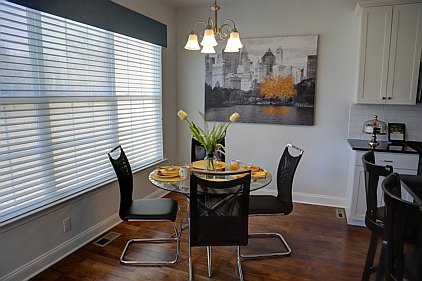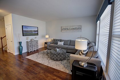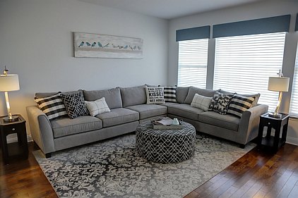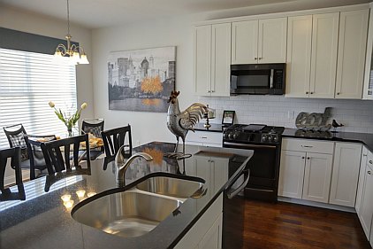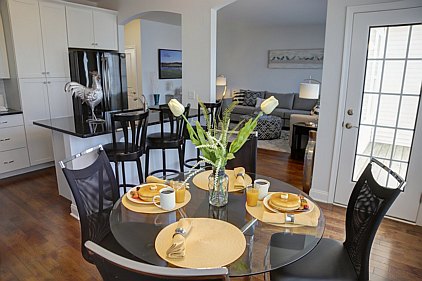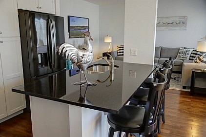 Our staff created this contemporary design with a color palette of grey, black, and turquoise. Galvanized metal accents and tailored fabric cornices are just a few of the small details that bring this three bedroom home together. White subway tiles and cabinetry offer a wonderful contrast to the kitchen's galaxy-black granite and black stainless steel appliances. All the furniture, artwork, area rugs, and accessories were hand-picked to compliment the architectural details of this home. Please feel free to contact us with your inquiries.